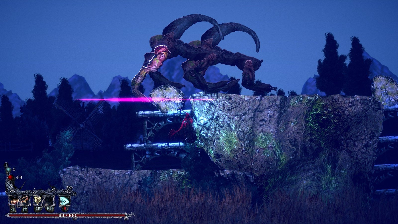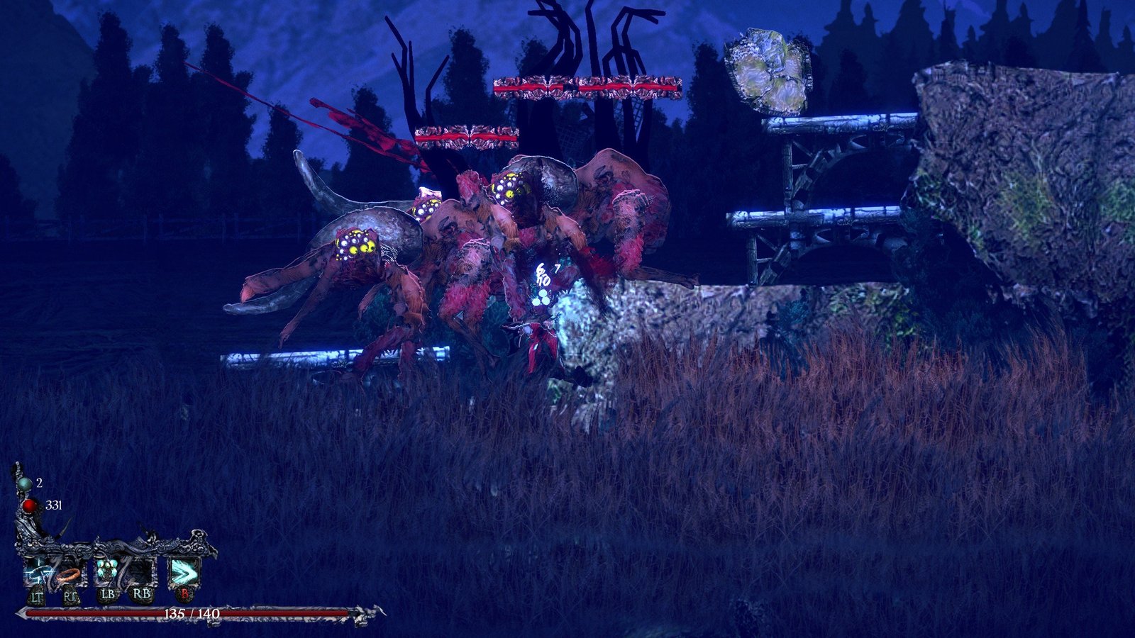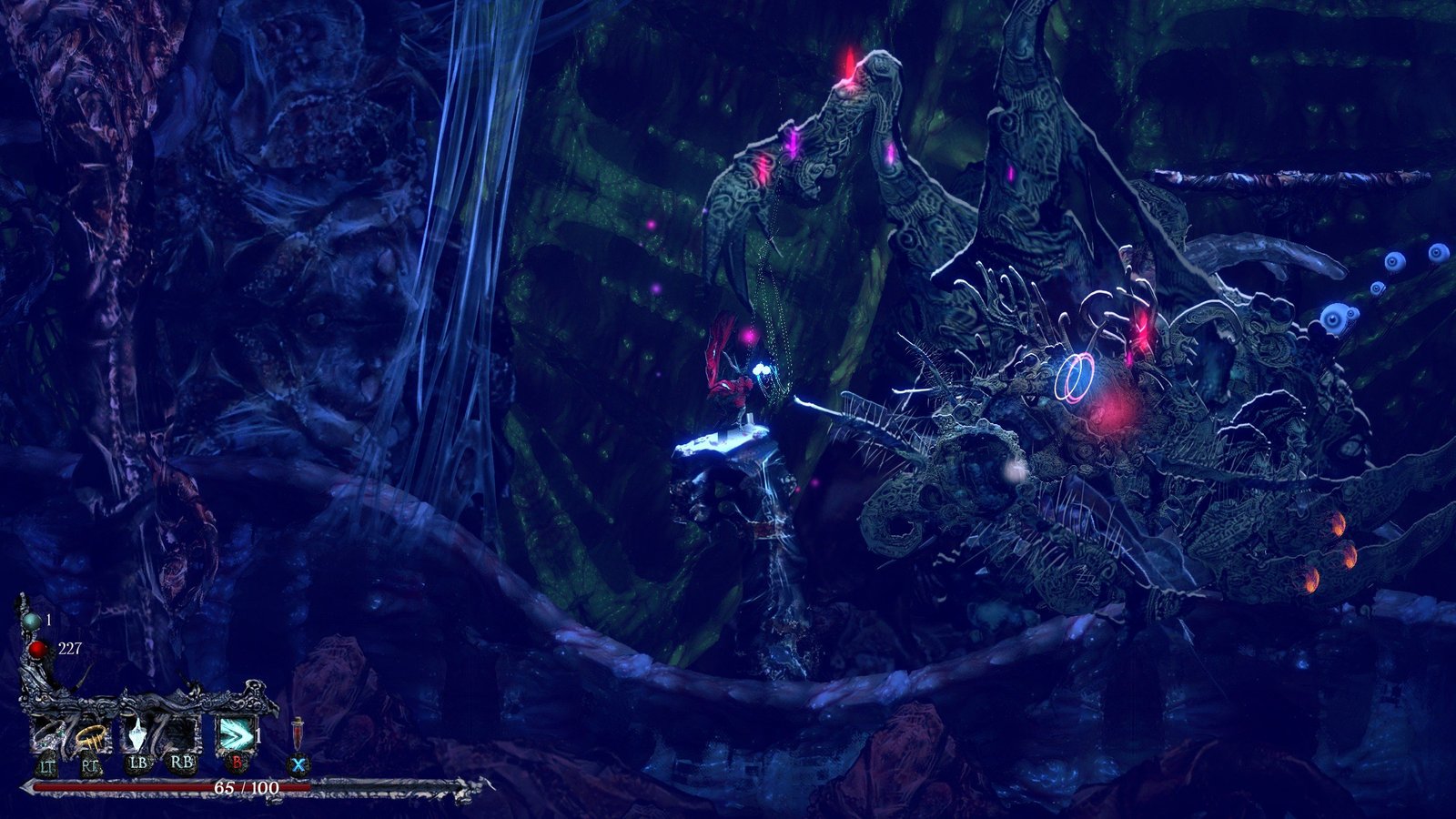 Finalement, parmi les ennemis, seuls les Boss ont trouvé grâce à nos yeux. Ceux-ci insufflent un charme nouveau aux combats dans la mesure où il est nécessaire de mettre à profit tous les éléments à disposition. Une fois certains éléments de l’arbre de compétence débloqués, cela devient vraiment plaisant d’organiser nos affrontements en amont. Les synergies opérables entre les différents compartiments de notre arsenal fonctionnent à merveille. Bien évidemment, il est rare de venir à bout d’un boss du premier coup. La plupart du temps, la victoire ne s’obtiendra qu’au prix du sacrifice de plusieurs disciples ayant servi de cobayes dans une simple quête de connaissances. Un élément qui peut toutefois se révéler frustrant concerne la quantité assurément faiblarde de ressources récoltées contre les boss. En effet, en complément du sang, une seconde ressource sera nécessaire pour faire cheminer votre progression sur l’arbre de compétences. Et la quantité nécessaire impose une répétition parfois lassante de nos efforts. Cependant, les bonus débloqués, certes coûteux, se révèlent très souvent déterminants à l’image des dash supplémentaires qui sont tout simplement salvateurs.