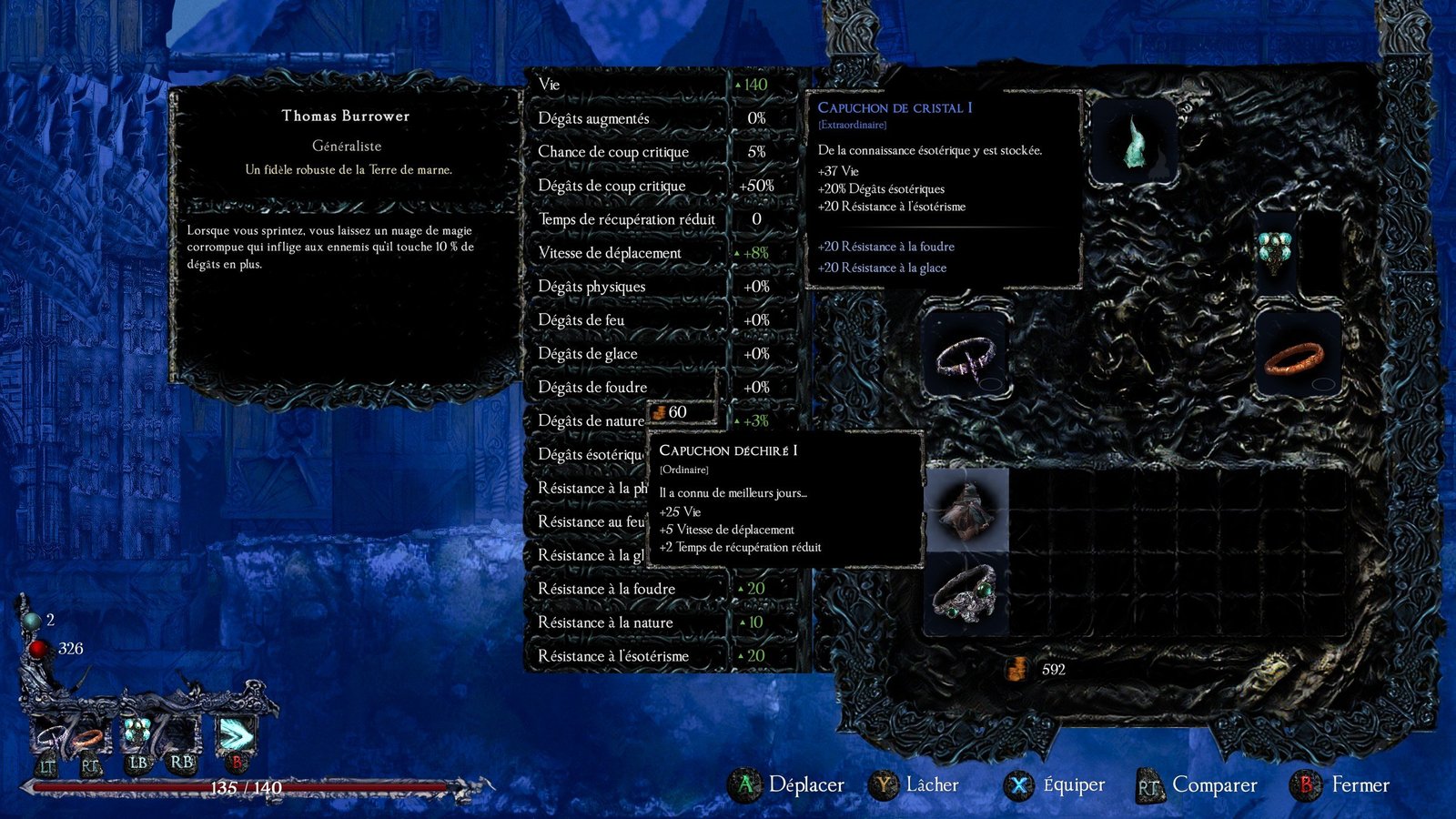 Par ailleurs, de bonnes idées se sont glissées dans le kit de possibilités qu’offre le jeu. Certaines formes de magie et les effets qui en découlent sont assez bien trouvés et entrent en symbiose avec l’atmosphère du jeu. Nous regrettons simplement que les types de magie ne soient pas plus fournis afin d’offrir encore davantage de variété, malgré le fait que le contenu demeure tout à fait acceptable. Au fur et à mesure de notre périple, nous trouverons nombre d’items : capuchons offrant de solides effets passifs, anneaux pour les sorts, gemmes à incruster dessus pour maximiser leur potentiel et items actifs qui viennent renforcer notre arsenal. Ceux-ci peuvent être dénichés sur les ennemis ou achetés dans la boutique, que nous aurons le plaisir de retrouver régulièrement. Celle-ci, bien que particulièrement sinistre, sera comme une respiration bienvenue où nous pourrons dépenser notre petit pécule pour renforcer notre équipement. Ce sera également l’occasion de nous séparer des items encombrants notre inventaire. En progressant dans le jeu, ceux-ci ne manqueront pas de s’amonceler. Car, avec le sang récolté sur les ennemis vaincus, on pourra débloquer du matériel de bien meilleure qualité par le biais de l’arbre de compétences disponible à chaque nouveau départ.