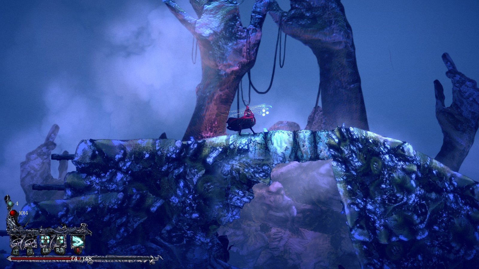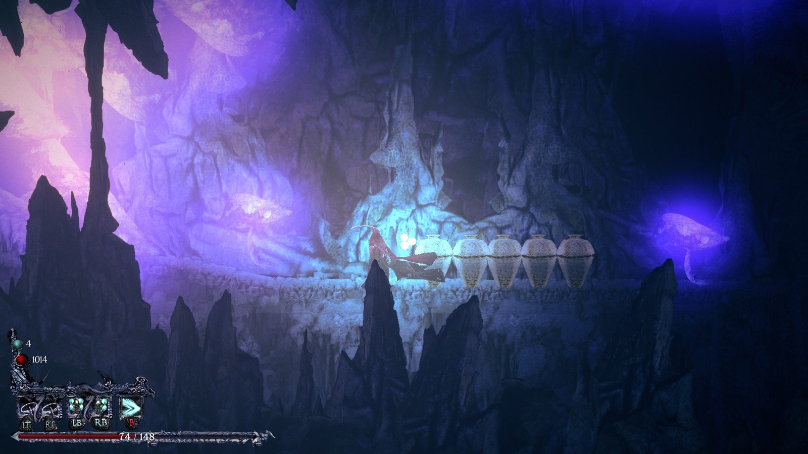 En ce qui concerne les graphismes, disons en premier lieu que l’aspect visuel du jeu sert complètement l’ambiance que nous avons décrite ci-dessus. Les paysages sombres et dévastés, parfois décharnés lorsqu’on pénètre dans les espèces de chambres de chair disséminées ça et là, réservent néanmoins quelques belles surprises. Cette beauté est à considérer au sens propre. Car effectivement, nous avons plusieurs fois stoppé notre progression un instant pour admirer le charme d’une cascade ou le reflet laiteux d’un champignon souterrain. Source of Madness parvient à créer de petits moments de beauté dans un décor macabre. Et cela n’est pas rien. Les décors servent l’exploration qui est assez instinctive. Armés de notre double saut, ainsi que de notre dash, on apprend petit à petit que les trésors se cachent dans les recoins les plus difficiles d’accès. L’escalade des tours et la fouille des galeries camouflées en arrière plan amènent leur lot de récompenses. Cet aspect se révèle très gratifiant, malgré le fait que le Loot soit évidemment aléatoire.