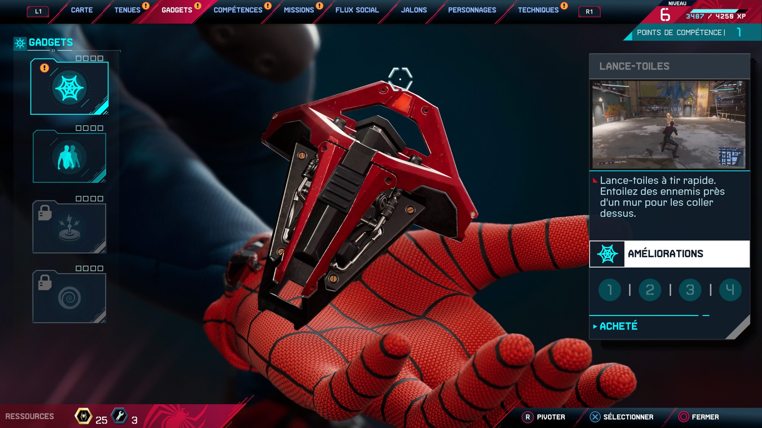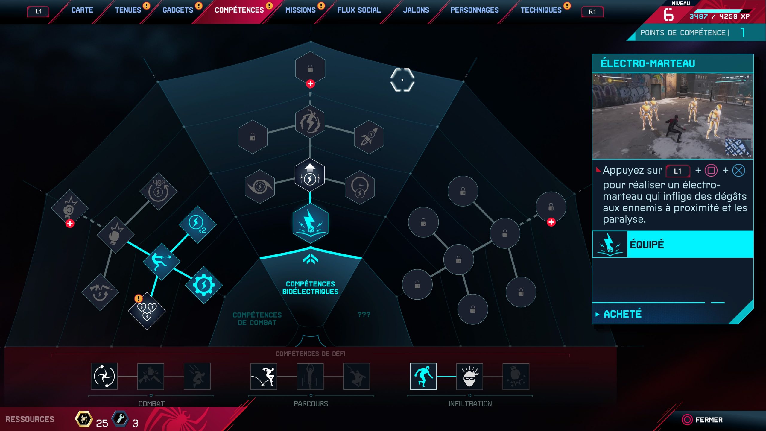 Dans ce Spider-Man Miles Morales les compétences sont nombreuses et intéressantes. Notre nouveau héros, apprend la capacité liée à l’électricité durant votre aventure. Il sera donc possible de charger des générateurs via votre compétence, électriser vos ennemis de les propulser en l’air. La capacité de se rendre invisible est également de la partie pour s’infiltrer dans les différentes bases ennemis. L’arbre des compétences est plutôt simple est il est possible d’obtenir les points de compétences en montant de niveau.