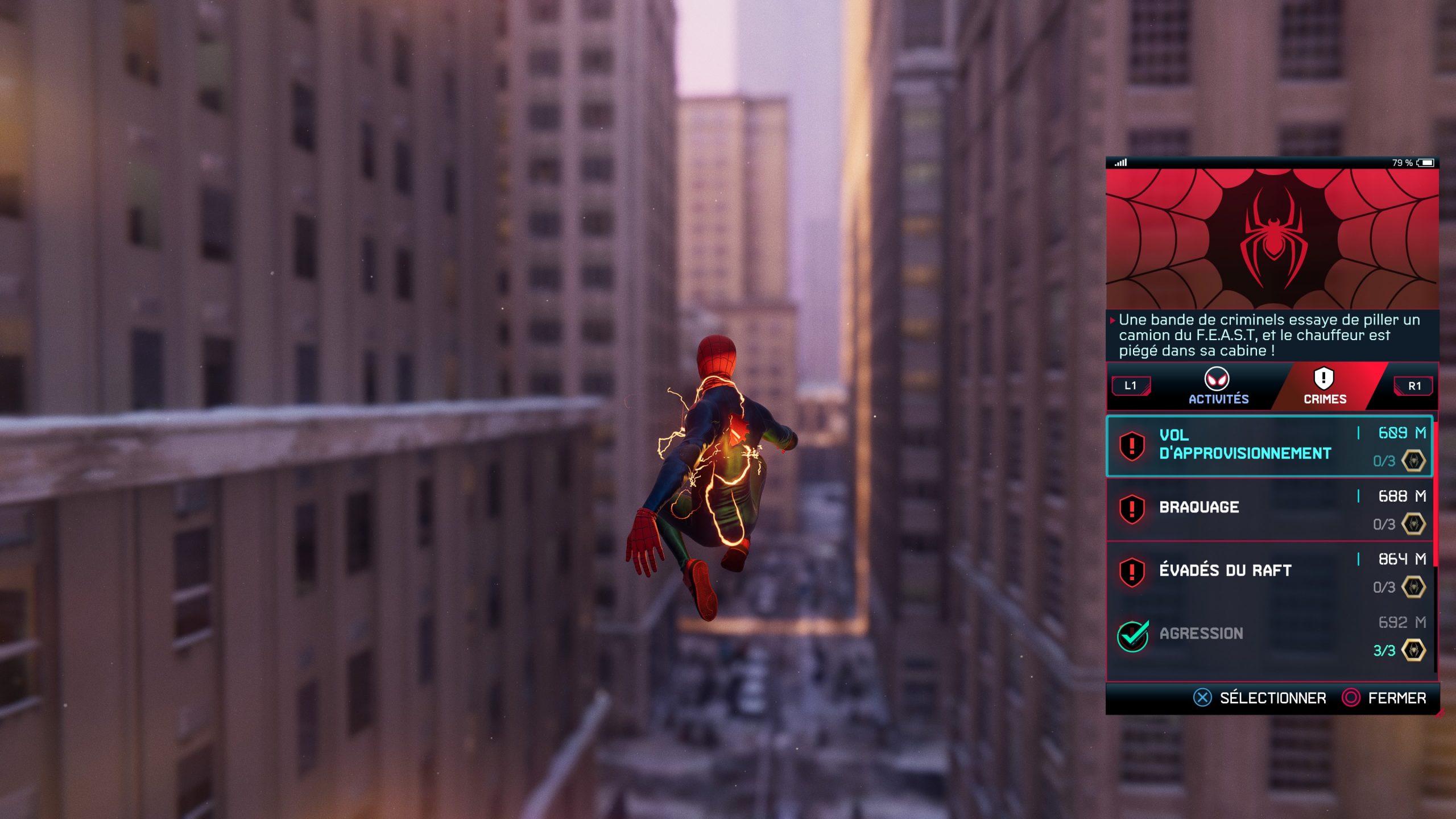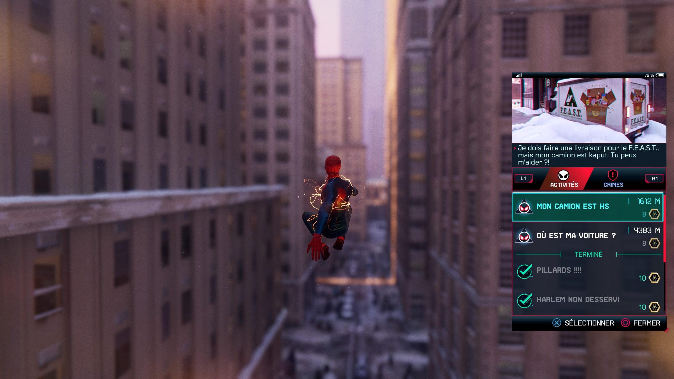 Vous retrouverez également ce que l’on appel, le flux social, de nombreux personnages dans la ville vont commenter les différents événements présents dans la ville de New-York. Il est également possible d’en savoir plus sur les différents personnages du jeu ou encore, de savoir quelles missions sont disponibles et a quel moment. Le menu de ce Spider-Man Miles Morales est très complet.