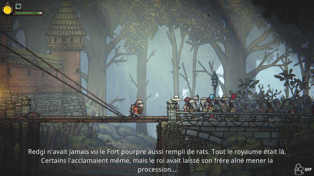 Tails of Iron est un hommage à différents types de jeu ayant marqué tout joueur qui se respecte. Niveau esthétique on aurait tendance à penser aux graphismes vu dans l’excellent The Darkest Dungeon. Son système de jeu tout en 2d s’apparente au jeu d’action 16 bits des années 90’s. Les décors sont fouillés et voir des personnages s’animer au premier et à l’arrière plan fait toujours son petit effet. Notamment quand il s’agit d’un boss que nous nous apprêtons à combattre. La map est assez grande mais Tails of Iron n’est pas un metroidvania. Pourtant, je n’ai pu m’empêcher de penser à Hollow Knight durant ma partie. Certes, les jeux sont très différents mais j’ai éprouvé le même type de plaisir à y jouer. De plus Redgi s’assoit également sur un banc pour sauvegarder et certains décors et ennemis font irrémédiablement penser au chef d’œuvre du studio Team Cherry.