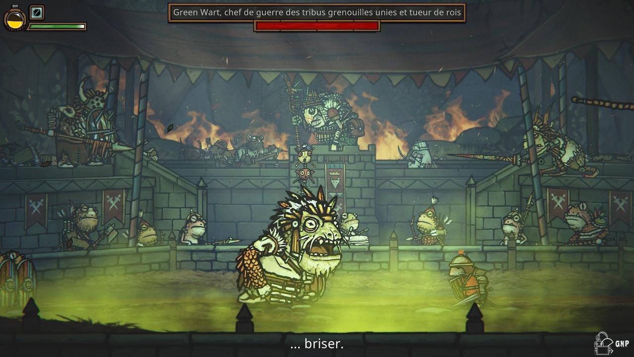 Le combat commence alors sous les acclamations des spectateurs venus nombreux voir le combat. Les attaques du grand frère sont puissantes mais la garde de Redgi tient bon. Rapide, le jeune rat esquive les coups et parvient même à repousser les assauts de son adversaire. Ces contre attaques sont moins dévastatrices mais nombreuses ! Tant est si bien que, contre toute attente, le plus jeune des rats l’emporte sur son aîné. Emu, il s’apprête à recevoir la couronne des mains de son père, quand soudain une lance vient transpercer la poitrine du souverain. Le bout de métal glisse entre ses doigts tandis qu’une armée de batraciens se déverse dans l’arène en massacrant les malheureux rongeurs se trouvant sur leur passage. A leur tête, le monstrueux Green Wart se dresse face au nouveau roi. Hélas Redgi, épuisé, ne peut rien et subit la violence des coups de l’imposante grenouille. Sa vision s’obscurcit et notre jeune héritier s’écroule…