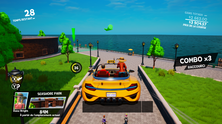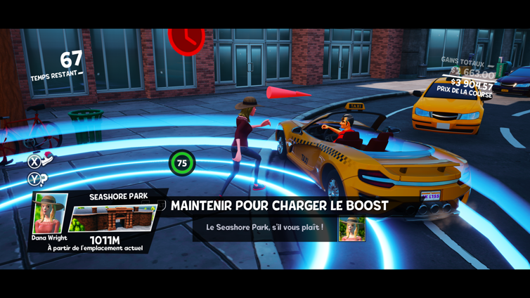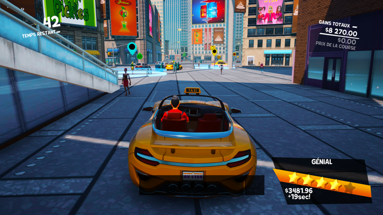 Pour le reste, rien n’a vraiment changé et ce Crazy-Taxi like reprend l’intégralité des codes d’Hitmaker et SEGA ! En effet, nous utilisons des taxis jaunes, nous récupérons des clients dans un cercle de couleur que nous devons déposer rapidement aux endroits demandés. Plus vous êtes rapides, plus les clients sont contents et meilleure sera votre note étoilée et la réception d’argent.