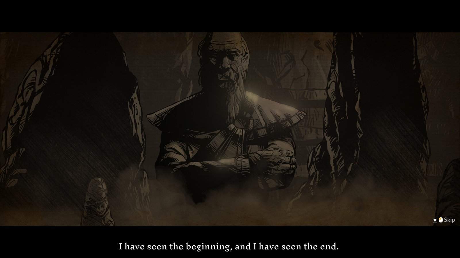 Le jeu dispose d’une solide structure narrative. Le lore profond et même parfois « épais » du jeu transparaît dans les innombrables dialogues et scènes qui se jouent sous nos yeux. Aussi, il nous paraît pertinent de mentionner le fait qu’il est véritablement nécessaire d’accepter ce parti pris. The Hand of Merlin offre une action hachée, à la croisée d’un Hand of Fate et d’un Wartales. Aussi, si vous n’appréciez pas la lecture dans les jeux en général, il peut être difficile de profiter du scénario. Les cinématiques, bien qu’à la fois finement réalisées sur le plan graphique et empreintes d’un minimalisme poétique, ne vous aiguillerons pas vers sa compréhension. Si en revanche, vous êtes de ceux qui aspirent à se délecter des traits d’humour insérés dans les dialogues, à se creuser les méninges pour déjouer les énigmes ou tout simplement à suivre le fil de l’histoire en spectateur attentif, vous serez comblés. Détail important toutefois : les textes sont intégralement rédigés en anglais. Le niveau de langue employé est plutôt de haut vol, ce qui placera le titre hors de portée de ceux qui aimaient à prolonger leur nuit durant les cours dispensés dans la langue de Shakespeare.