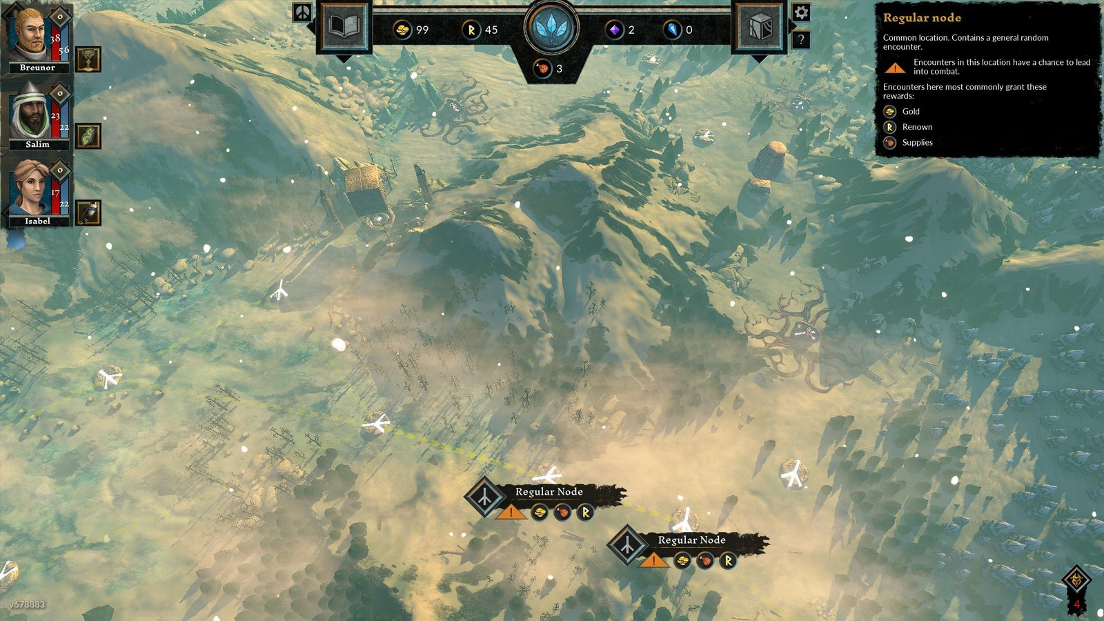 Autre élément qui compose notre build, les reliques offrent la possibilité d’obtenir des effets supplémentaires qu’il faudra marier avec les archétypes de nos héros. Pour maintenir le lien avec notre mentor Merlin, le jeu offrira, en diverses occurences, la possibilité de glaner de l’essence et du mana. Si la première permet simplement de débloquer des sorts, la deuxième permettra quant à elle de les lancer au combat. Téléportation de héros, dégâts bruts ou de zone, soin direct… les possibiltiés offertes par cet élément sont multiples et renouvellent le gameplay des combats qui ont une fâcheuse tendance à devenir monotones. Terminons à présent notre analyse en nous penchant sur la rejouabilité. Celle-ci, bien qu’abreuvée par les innombrables lignes de texte et évènements divers que l’on peut rencontrer, trouve sa limite sur deux points. En premier lieu, les cartes explorables et qui composent notre odyssée dans sa partie macroscopique (aller de points en points) demeurent identiques à chaque partie. Bien que leur intérêt soit pérénnisé durant les premières heures de jeu par la curiosité que suscitent les chemins possibles, cette ardeur s’essouffle vite. Il faut toutefois mentionner la beauté des graphismes, les textures proprement ciselées attirent l’oeil et l’on prend plaisir à laisser divaguer nos yeux pour découvrir les éléments illustrés sur la carte.