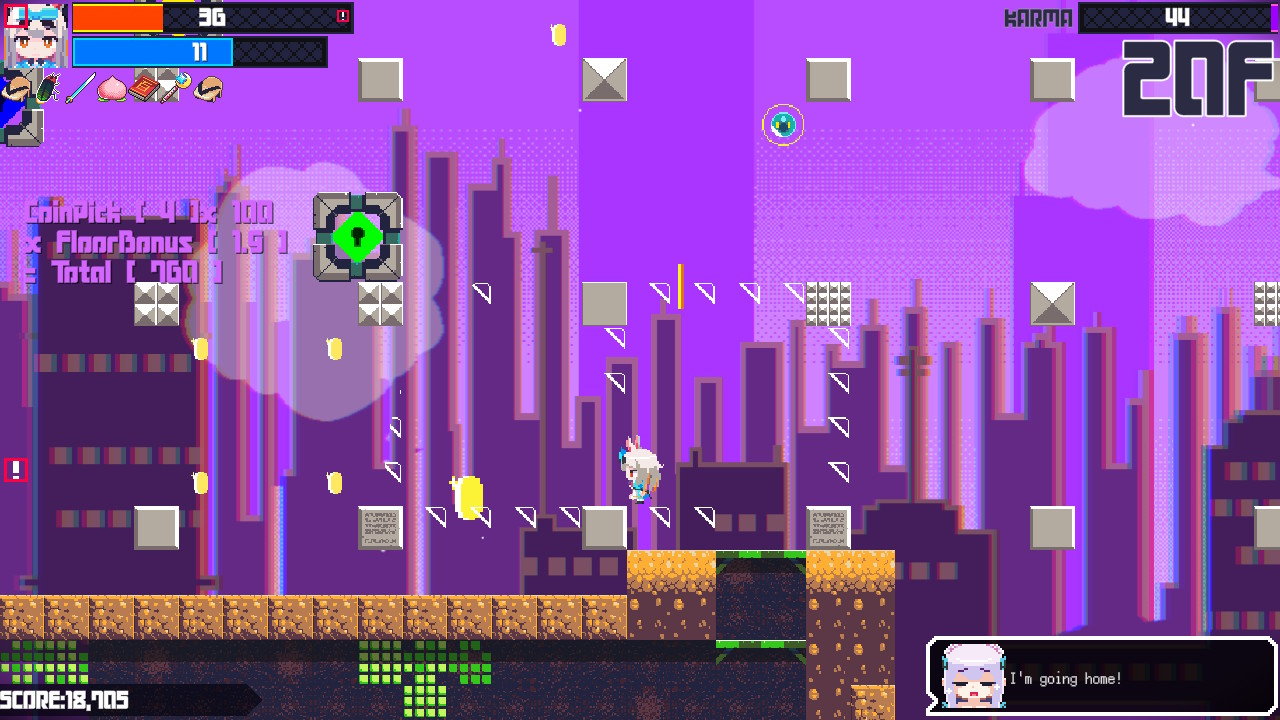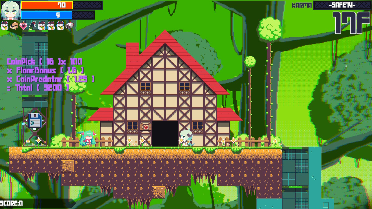 Parlons donc de ces items. Ces derniers revêtent une importance capitale dans TOKOYO, ayant moult effets différents et cumulables. Entre le Supersonic Dash Motor qui augmente notre vitesse de 5%, le Kanesada Blade qui lorsque nous nous faisons toucher invoque un sabre qui fait des dégâts pendant 1,7 seconde, l’Yggdrasill Dewdrop qui restore 4,5 HP à chaque étage atteint, la Succubus Essence qui réduit le temps de debuff de 1,9 seconde, ect… Il en existe un très grand nombre qui s’afficheront en bas à gauche de l’écran de jeu. Voici pour le gameplay. Le jeu de PLAYISM se veut exigeant sans être extrêmement punitif. Les morts seront nombreuses, certes, mais jamais injustes. Si nous mourrons c’est par notre faute. Bien entendu, nous engrangeons des points qui servent au classement final.