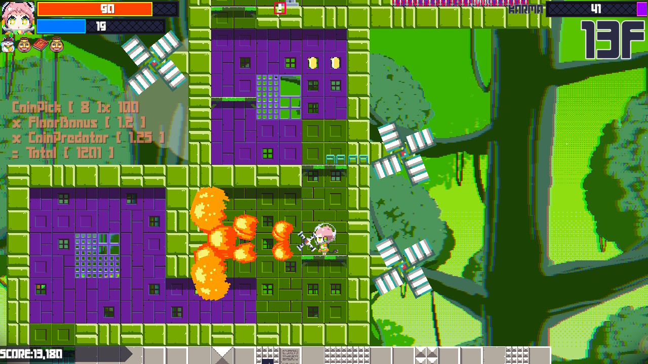 Quand il nous arrive de mourir, il est alors possible de ressusciter en sacrifiant une partie de ses points. Ainsi, nous pouvons continuer à grimper mais notre score baisse. Cette fonctionnalité est donc très pratique. Surtout contre les boss qui seront au nombre de quatre tout au long de la montée. C’est peut-être bien là le défaut de TOKOYO The Tower of Perpetuity. Ces quatre ennemis plus puissants que les autres sont des copies, seule leur couleur les différencie. Une fille dans un gros robot volant et envoyant des boulettes de toute sortes autour d’elle. Ce sont loin d’être les boss les plus durs vus dans ce type de jeux et ils auraient mérités d’être de vrais « obstacles ». Il est même possible de s’entraîner à les combattre depuis l’écran de départ. C’est un peu regrettable mais ils sont un peu le reflet du jeu dans sa globalité. Nous ressentons une certaine absence de « densité » et de véritable challenge. En somme, un jeu parfait pour se mettre en jambes avant de passer à plus difficile.