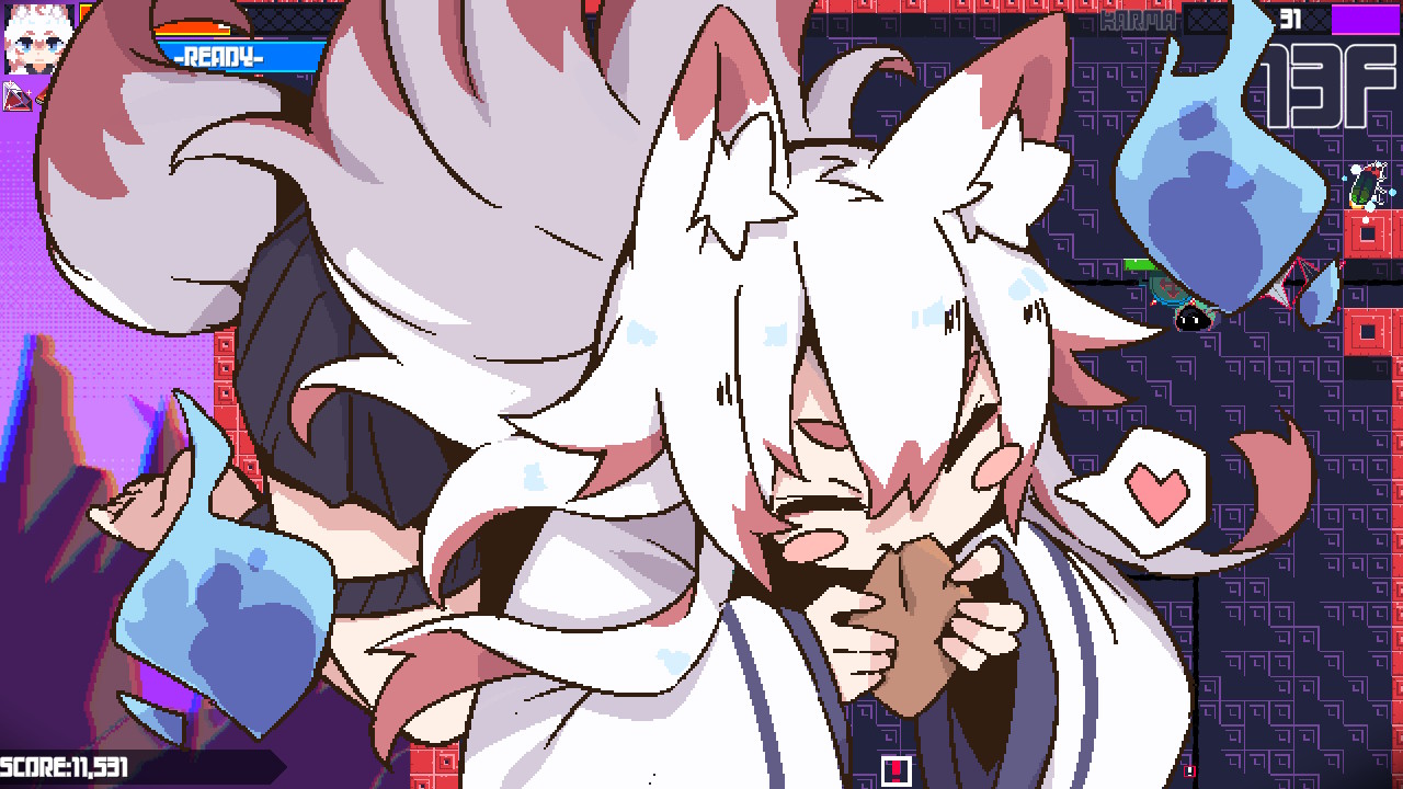 Un seul. Une fille nommée Imibi, habitée par l’esprit du renard, invoque autour d’elle un grand carré qui tourne sur lui-même. Chaque ennemi prit dans son périmètre est de suite l’objet d’une rafale de missiles magiques. Une sorte de petit singe nommé Kanae portant un globe de cosmonaute sur la tête envoie deux gros jets de flammes face à lui. Ceux-ci zigzaguent et s’entrecroisent pour brûler tout ce qui passe. Une petite blonde affublée de deux cornes et d’une queue de démon, s’appelant Cocoa, fait tournoyer quatre épées autour d’elle. Ainsi de suite… Aucune attaque normale n’est disponible et il faut attendre trente secondes avant la prochaine utilisation de notre pouvoir. Ce temps de recharge peut être baissé à l’aide d’items et en attendant il s’agira d’éviter tout contact. Et n’espérez pas rester dans un coin sans bouger, le jeu vous enverra vite un ennemi très énervant pour vous déloger.