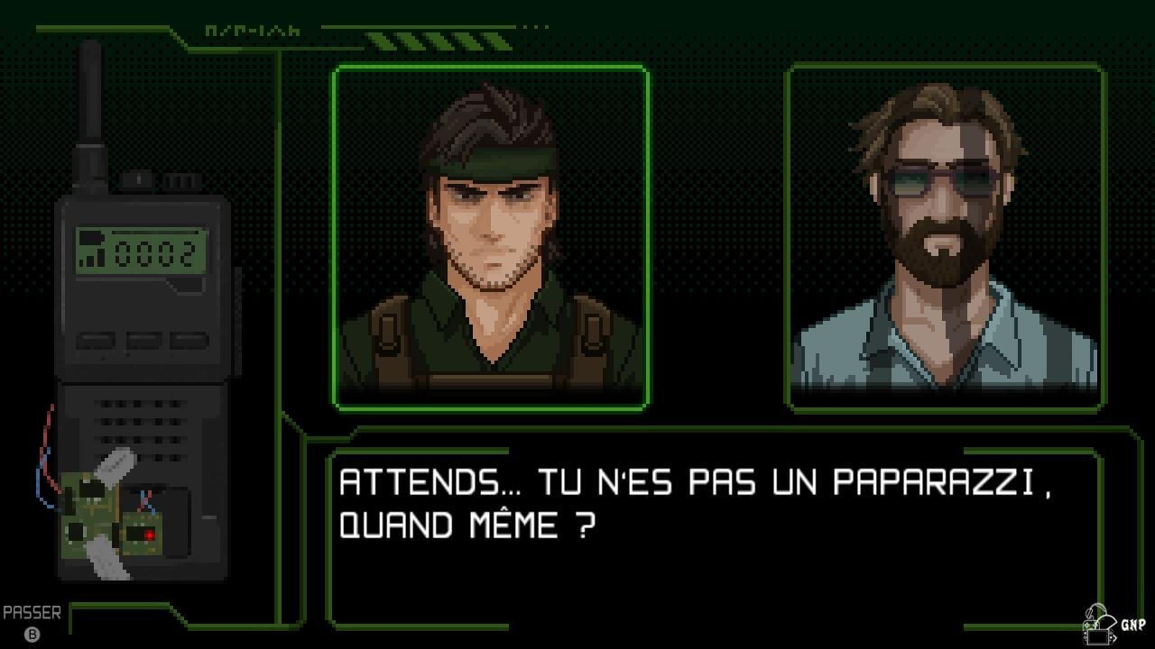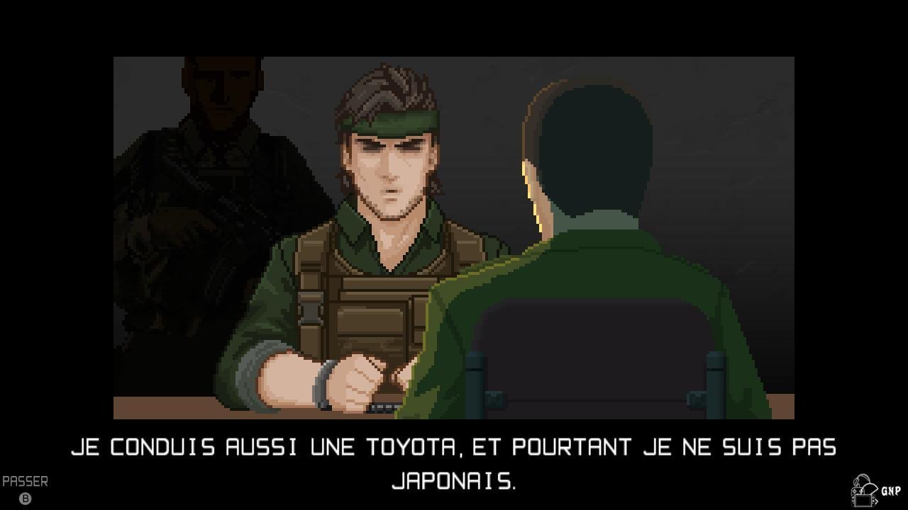 Test UnMetalUne représentation vue du dessus en 2d pixelisé (même les personnages s’en amusent d’ailleurs), un inventaire et plusieurs touches d’actions, il n’en faut pas plus pour être projeté au cœur du jeu. Ainsi, un bouton vous sert à frapper de vos poings, un autre permet d’effectuer des roulades et un troisième est là pour utiliser un objet de l’inventaire comme une pièce de monnaie.
