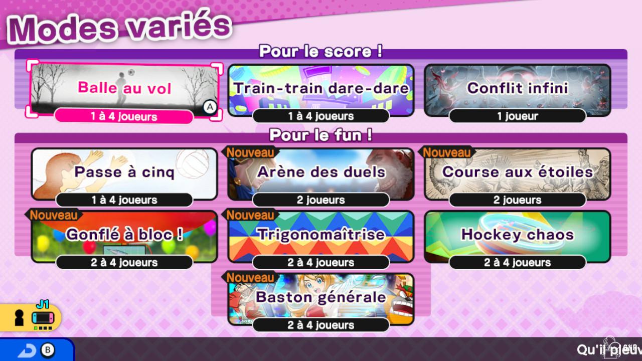 Modes variés : Derrière ce nom, il se cache de nouvelles épreuves de Wario ! A la grande différence qu’ici tout est prévu pour jouer à plusieurs. En effet, le mode varié propose une dizaine de mini-jeux jouable jusqu’à 4 joueurs ! Au programme, du fun et du contenu diversifié avec du sport, du combat, de la course ou encore de la maitrise.
