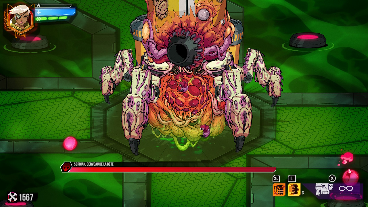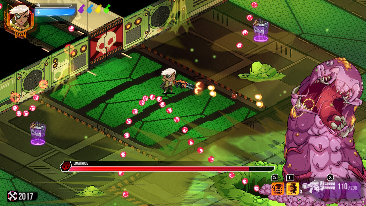 Retourner au point de contrôle signifie reprendre au début du niveau avec les salles remplies à nouveau de monstres. A noter que la carte est fixe, aucune génération procédurale, ce qui n’est pas plus mal, car vu la difficulté du soft il est bon de connaître les lieux par cœur. Mais cela permet de s’acheter de nouvelles armes principales, celles qui possèdent des munitions infinies, ou bien d’améliorer notre dash, d’augmenter notre nombre de résurrections possibles, de changer de type de grenades, etc… Nous devenons peu à peu plus forte et rapide. Si je parle d’arme principale c’est que nous portons également une arme secondaire. Celles-ci se dégottent dans les niveaux et leurs munitions sont comptées. Lorsque nous choisissons de reprendre au début, nous gardons tout de même les différentes clés de couleurs que nous avons trouvé. Ces clés ouvrant l’accès aux parties de la carte de la couleur correspondante. Quant aux nouvelles armes à acheter, celles-ci apparaissent comme par magie dans la boutique à chaque nouveau stage atteint. Elles sont en général plutôt adaptées aux salles environnantes. Vraiment de styles divers, à vous de trouver le bon duo.