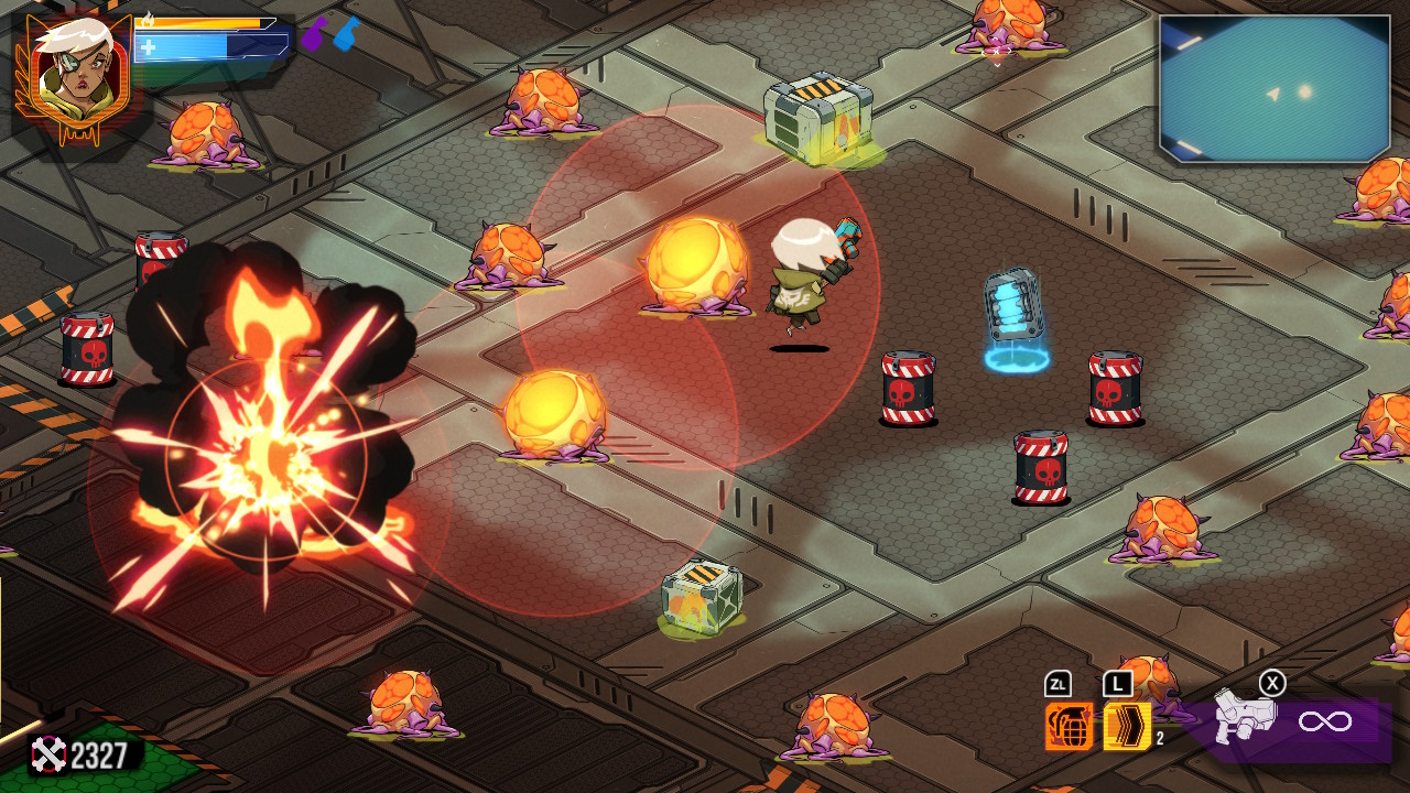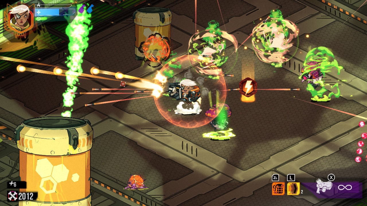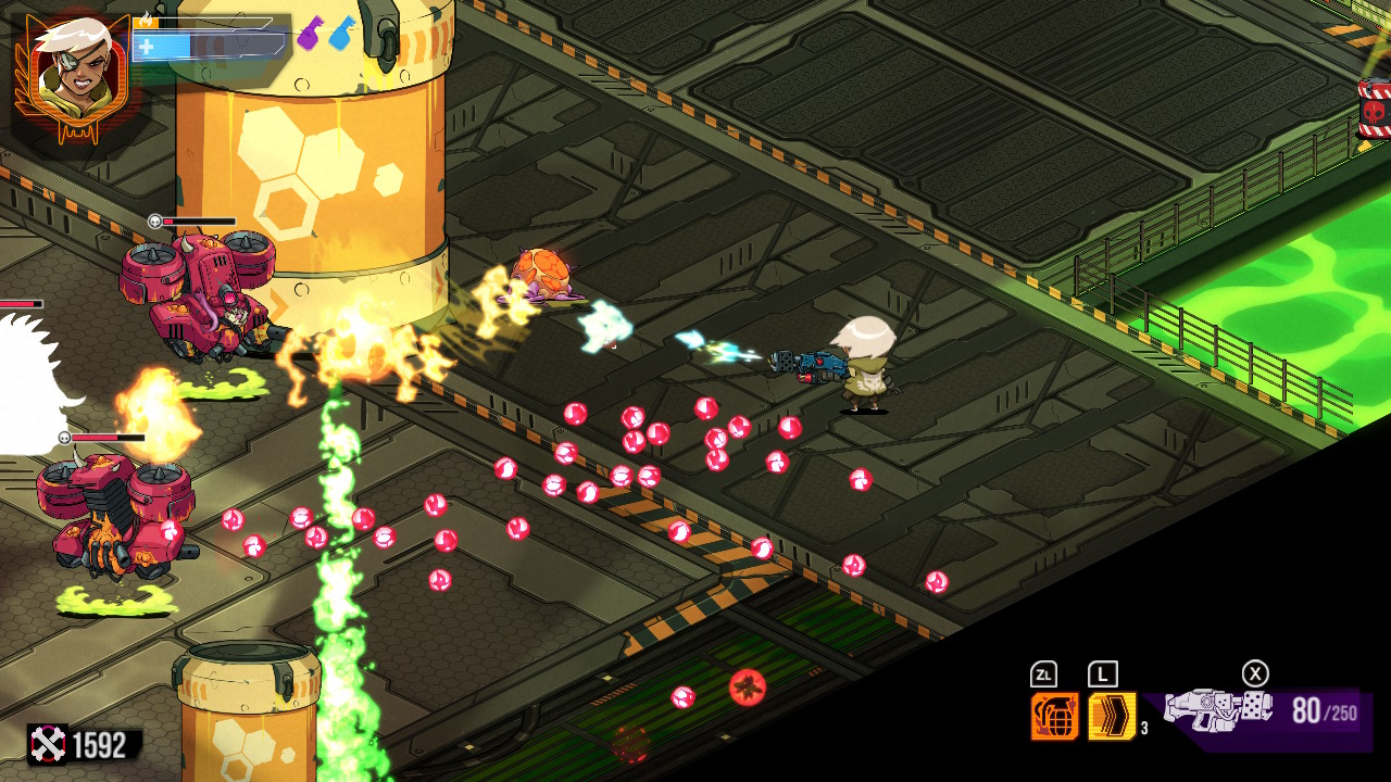 Maintenant que nous avons passé en revue le scénario (hein ?) et la réalisation, venons-en à ce qui fait que j’ai passé, et que je passe encore, un très agréable moment sur Wildcat Gun Machine : son gameplay. La dénomination bullet hell veut bien dire ce qu’elle veut dire. Il n’y a pas à sourciller, c’est un jeu dans lequel c’est le skill qui parle. Bien entendu, nous avons accès à diverses améliorations, mais face au déluge, le terme n’est pas trop fort, il s’agira de garder son calme et d’avoir les yeux partout. Réagir vite deviendra une seconde nature. Bouger avec le stick droit et diriger son tir avec le stick gauche. Dash, grenades et tir se trouvent sur les gâchettes. Le joueur doit utiliser tout ça sans réfléchir tout en naviguant entre les boulettes. C’est le penchant manic shooter de la chose. Chaque salle représente un réel défi et ce dès le début du jeu.