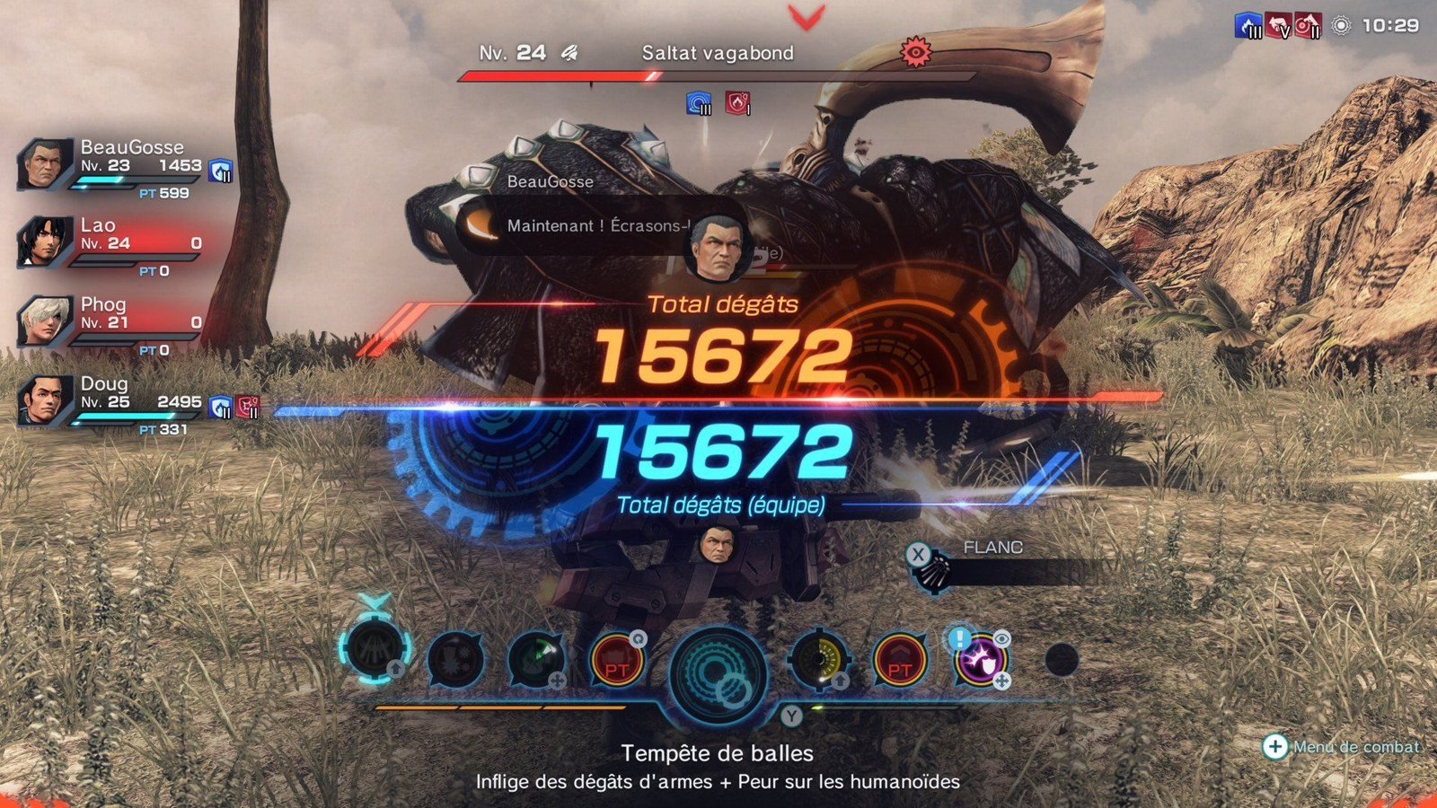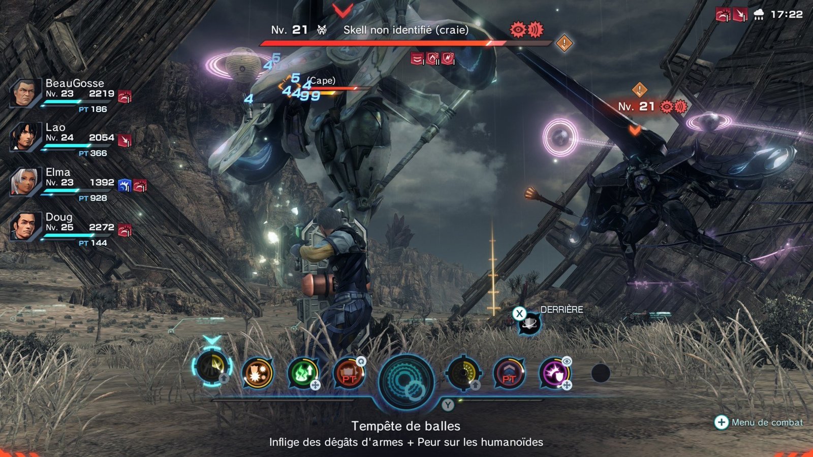 D’ailleurs, parlons des compétences : celles-ci ne sont pas figées dans le temps, et l’on disposera d’un arbre de compétences qui évoluera au fil de l’exploration. Vous démarrez le jeu en tant qu’aventurier, et une fois le niveau maximum atteint, vous pourrez évoluer vers la classe suivante ! Dans les faits, c’est sympa, mais vous reprendrez tout à zéro au niveau des compétences sur le terrain, là où vous avez tout déverrouillé sur celle d’avant… Néanmoins, vous pouvez utiliser la classe précédente pour un combat puis revenir à la suivante, car dans Xenoblade Chronicles X, vous faites ce que bon vous semble. Vous l’avez compris, l’arbre de compétences vous propose de faire évoluer votre classe de joueur, mais vous devrez apprendre de nouveaux arts que vous pourrez utiliser au combat. Pour chaque personnage, vous disposez de deux armes, voire d’un bouclier et d’une arme, avec une barre centrale qui apparaît au milieu de l’écran. Cette barre est un hub permettant de lancer les attaques et d’utiliser vos PT.