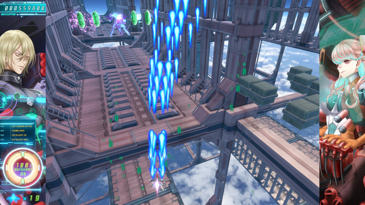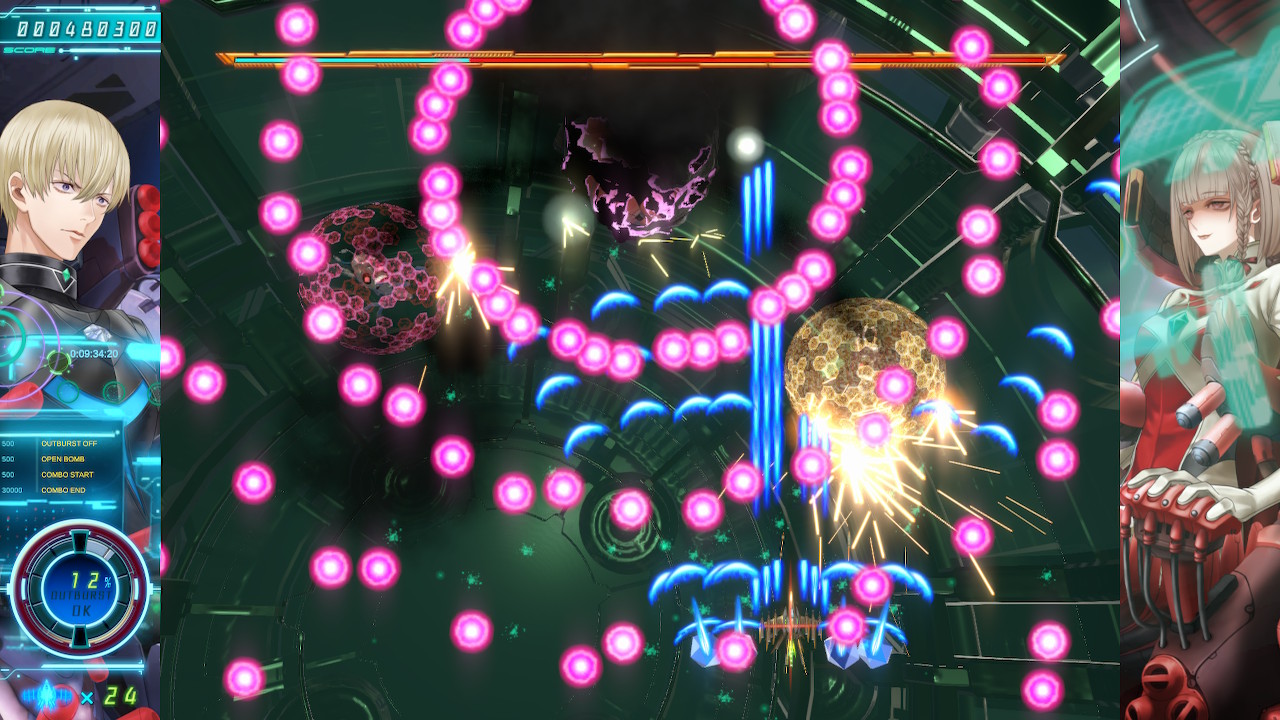 Cette phase prend la forme d’un shoot em up classique à tendance danmaku, en 4/3 et à défilement vertical. Tout se joue sur 4 boutons. Le premier permet un tir automatique « large » avec un déplacement rapide. Le deuxième vous permet de concentrer vos tirs et de ralentir votre vaisseau.