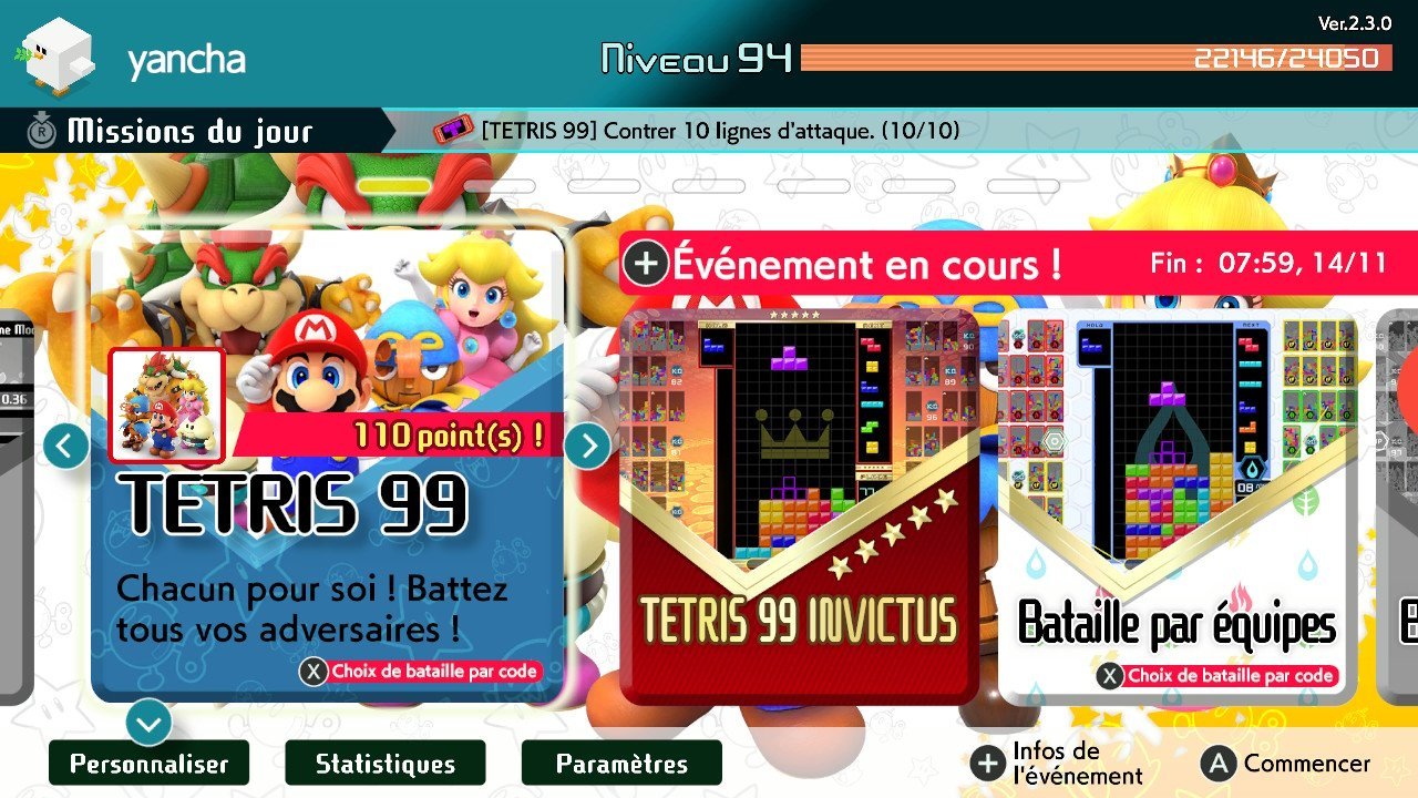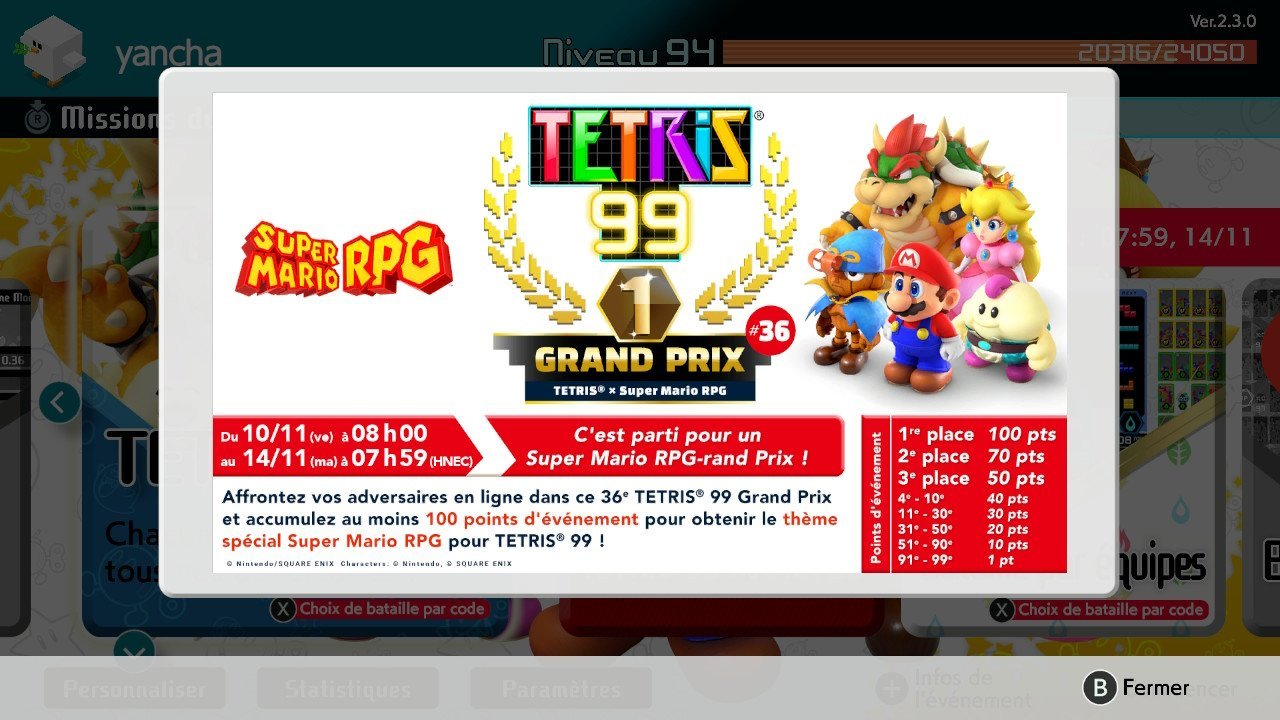 Après avoir mis à l’honneur l’excellent Xenoblade Chronicle 3, Tetris 99 vous propose actuellement un grand prix consacré à Super Mario RPG. En effet, vous avez jusqu’au mardi 14 novembre à 7h59 pour récupérer un thème consacré au prochain titre de Nintendo. L’occasion de relancer une petite partie de Tetris sauce Battle Royal et montrer votre suprématie !