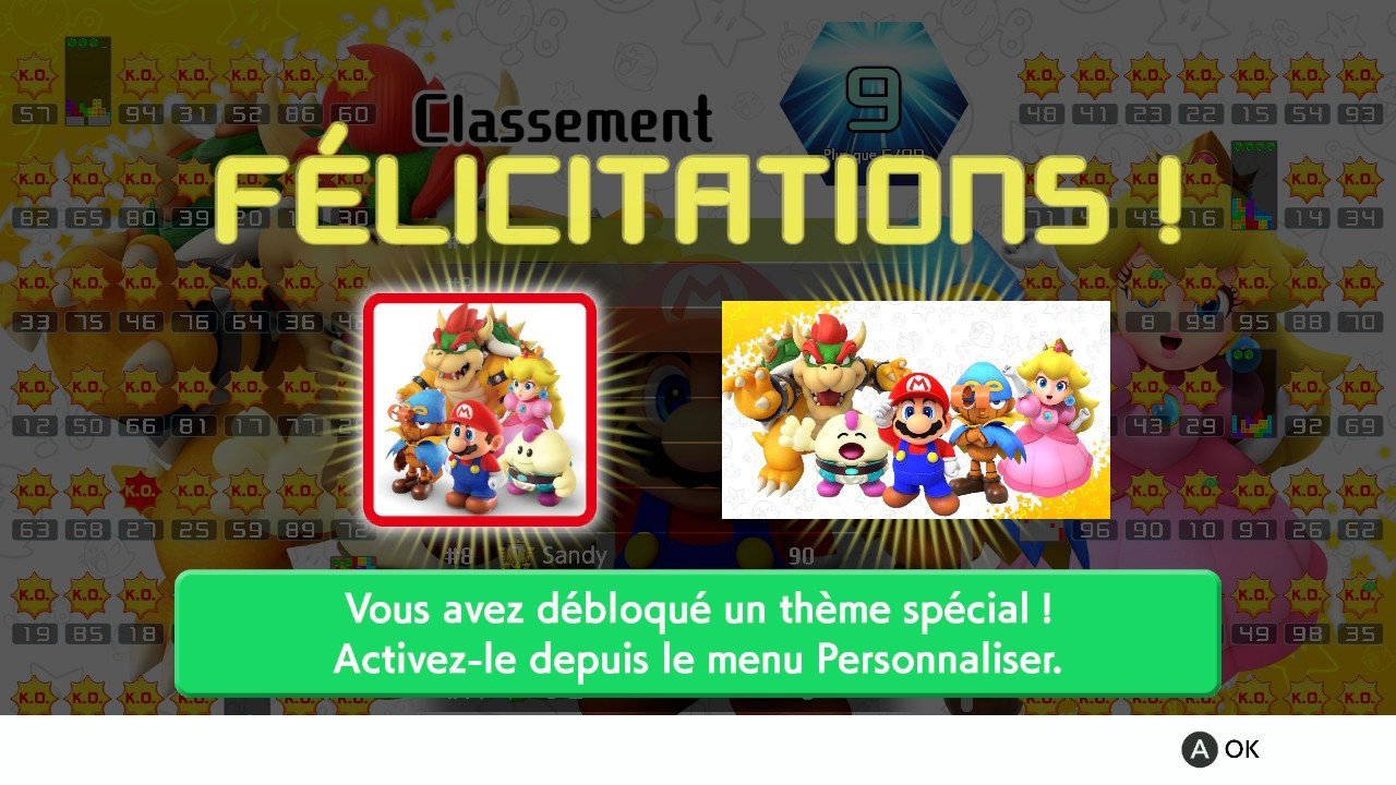 Pour rappel, Tetris 99 est un titre gratuit pour les abonnés au service de Nintendo. Jouable uniquement en ligne, le titre vous confronte à 98 adversaires dans une sorte de battle royal sauce puzzle game. En effet, vous devrez essayer d’être le dernier survivant. Pour obtenir le fameux thème proposé lors de ce grand prix, il vous faudra 100 points. Ainsi, soit vous gagnez vos 100 points en une fois en étant premier, soit vous jouez 100 fois en étant dans les 10 derniers. Autrement dit, vous n’avez aucune excuse pour ne pas récupérer ce thème. Les joueurs classés entre la 2e et la 90e place reçoivent désormais plus de points qu’auparavant, il est donc maintenant encore plus facile de débloquer des thèmes exclusifs dans Tetris 99.