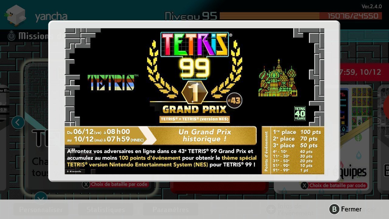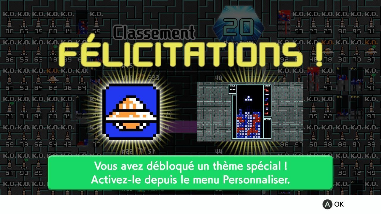 Pour rappel, Tetris 99 est un jeu gratuit pour les abonnés au service de Nintendo. Jouable uniquement en ligne, le jeu vous confronte à 98 adversaires dans une sorte de bataille royale sauce puzzle game. En effet, vous devrez essayer d’être le dernier survivant. Pour obtenir le fameux thème proposé lors de ce grand prix, il vous faudra 100 points. Ainsi, soit vous gagnez vos 100 points en une fois en étant premier, soit vous jouez 100 fois en étant dans les 10 derniers. Autrement dit, vous n’avez aucune excuse pour ne pas récupérer ce thème. Les joueurs classés entre la 2e et la 90e place reçoivent désormais plus de points qu’auparavant. Il est donc maintenant encore plus facile de débloquer des thèmes exclusifs dans Tetris 99.