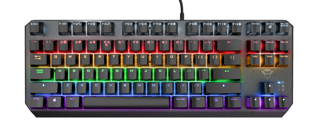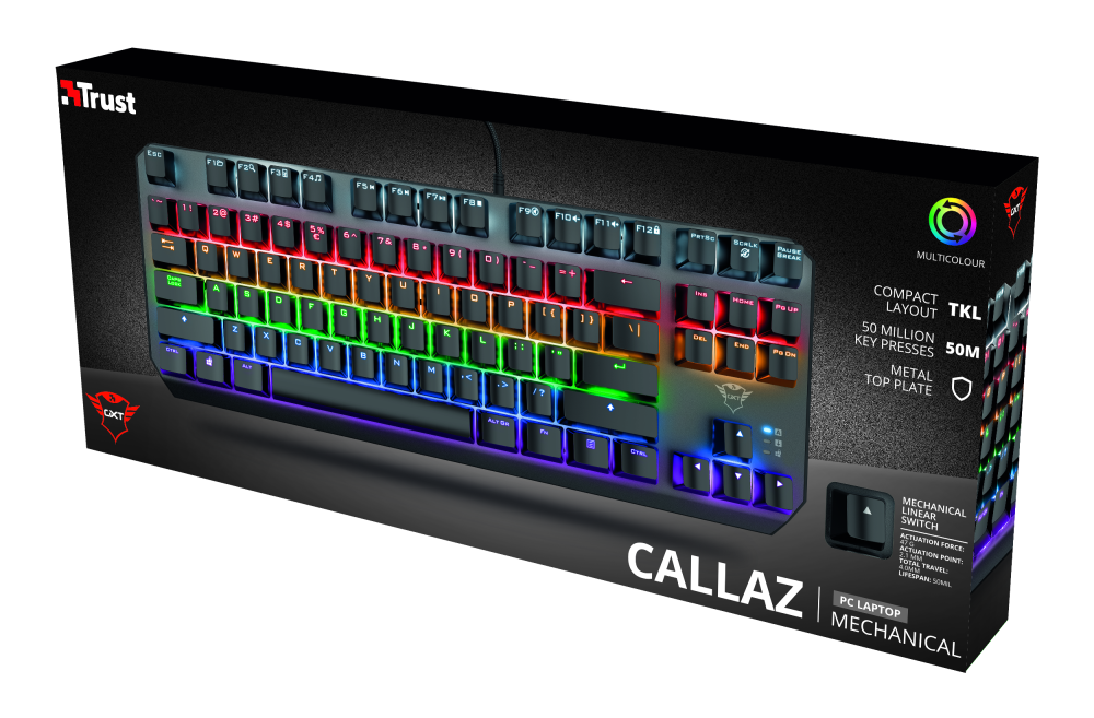 Le GXT 834 Callaz s’inscrit directement dans la gamme de clavier portable et compact de Trust. Que ce soit pour vos déplacements, participer à une LAN, gagner de la place sur votre bureau ou parce que vous disposez d’un pavé numérique indépendant, son format TKL est idéal avec une longueur de seulement 36 cm. Il est aussi robuste qu’élégant avec sa plaque en métal brossé et ses touches rétroéclairées résistantes à 50 millions de clic. 6 couleurs et 20 modes offrent à l’éclairage aux effets arc-en-ciel une personnalisation complète. Pensé pour le jeu, la petite taille du Callaz ne l’empêche pas de présenter de grandes performances avec ses Switchs Outemu rouges et ses fonctionnalités anti ghosting, n key rollover et son mode gaming.