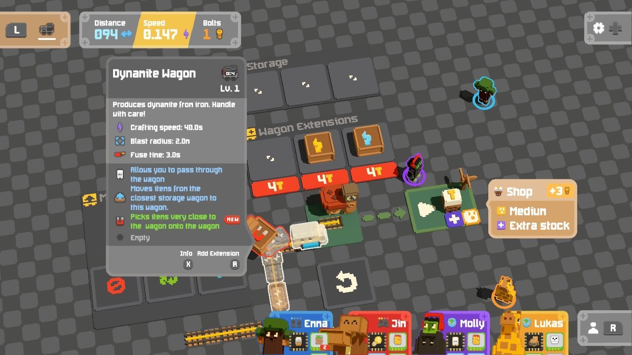 Unrailed 2 est un jeu multijoueur coopératif au rythme haletant qui vous demande de travailler ensemble pour permettre à votre train d’avancer dans des mondes générés de manière procédurale. Jusqu’à quatre personnes peuvent collaborer pour récolter des ressources et poser les voies pour empêcher la locomotive de dérailler, malgré les aléas d’un environnement en perpétuelle mutation.
