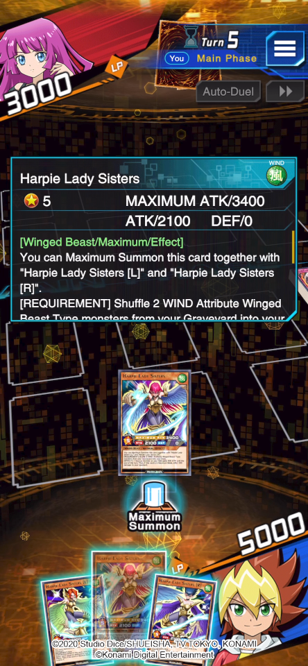 Par exemple, un Duelliste peut se servir de l’Invocation Maximum pour remporter la victoire grâce aux Sœurs de Harpie, trois cartes inédites. Il lui suffit simplement d’invoquer ensemble Sœurs de Harpie [G], Sœurs de Harpie et Sœurs de Harpie [D] afin de créer une créature ailée unique bénéficiant de 3400 ATK. Ces cartes sont en outre disponibles en tant que récompenses de connexion gratuites durant la campagne. Les joueurs peuvent également collecter des Compétences Archive Rush Edition ainsi que le Tapis de Jeu et les Protections en jeu à l’effigie des Sœurs de Harpie. D’autres bonus de connexion se verront distribués chaque jour. La liste se trouve juste en-dessous.